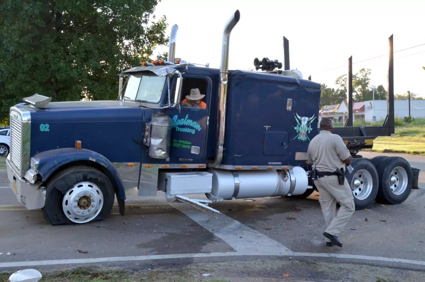 The driver of the Freightliner — cab doors were marked Boatman Trucking — was overheard telling a policeman that the bus crossed in front of him and he was unable to avoid it.