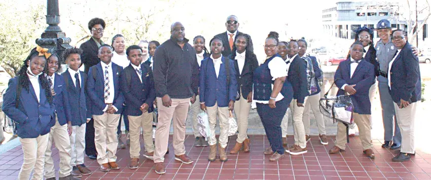 Students and chaperones from R.H. Bearden Elementary School of Sumner are pictured visiting with local legislators, District 13 state Sen. Sarita Simmons (back left) and District 30 state Rep. Tracey Rosebud (back center), during a class trip to the Mississippi Capitol building in Jackson on Wednesday, Feb. 26.