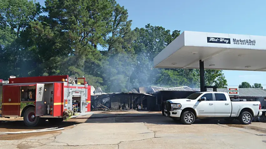 The smoldering remains of Mid-Way Market & Deli are pictured at 9:30 Monday morning, some six hours after the fire at the store was first reported. Much of the store was destroyed, and firefighters said much of the section left standing, at right in the picture, sustained heavy smoke and/or water damage. (Photo by Clay McFerrin, Copyright 2024 Emmerich Newspapers Inc.)