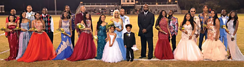 Members of Charleston High School’s 2021 homecoming court are pictured following Oct. 22 halftime homecoming festivities at Tiger Stadium on campus. From left are freshman maid Keymorriah Powell, with escort Marcus Hamilton; sophomore maid Ta’Moria Shannon, with escort Demario Shannon Sr.; junior maid Neveah Housley, with escort Marvin Housley; senior maid Aaliyah Bridges, with escort Marcus Taylor; escort Marcus Flowers Sr., with senior maid Adrianna Flowers; former Miss CHS Shakyra Truly; Miss Kindergarten Sariyah Truly; CHS homecoming queen Mya Stokes, with escort Willie Wells; Mr. Kindergarten Tevin Payne Jr.; CHS Principal Eric Rice; senior maid Ty’Anna Drain, with escort Willie Boclair; junior maid Ant’Reka Drain, with escort Jason Townes; escort DeAntre Prince, with sophomore maid Shaniya Moore; and escort Berlin Taylor, with freshman maid Sariyah Boyd. (Photo by Clay McFerrin)