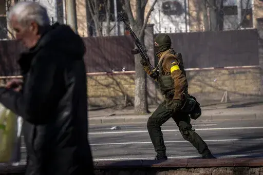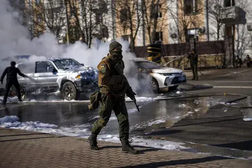 — Ukrainian soldiers evacuating an unmarked military vehicle damaged by gunfire in Kyiv, in the Obolon district about 10 kilometers (6 miles) north of the government quarter.