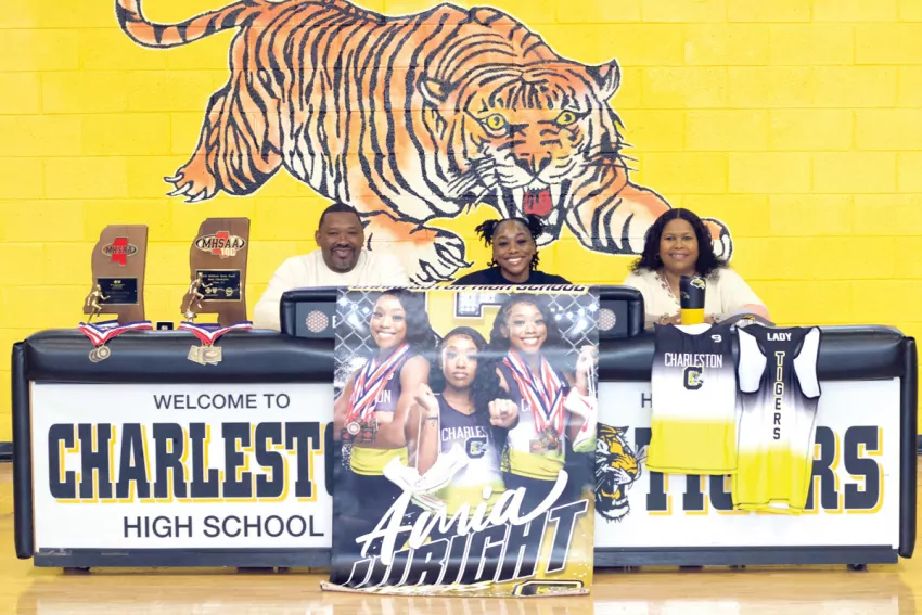 Members of the Charleston High School Lady Tigers basketball team pose with the Region 3-2A tournament championship trophy which they won in dominating fashion, 61-31, over the Riverside High School Bulldogs Friday night. The game was played at Northside High School in Shelby. The Lady Tigers finished the regular season with a sweep of their region. Above, player Tamoria Shannon squats in front alongside head coach Mandy Moore, who holds the championship trophy. Standing, from left, are Nathalie Randolph, Sandeon Edwards, Ka’Mina Mason, Carmen Strong, De’moria Shannon, Alysun McIntyre, Diekyra Bradford, Shamiya Bass, Amia Wright, Jada Leavy, Tykeria Davis, Tambria Price, Janiya Taylor, Shaniya Moore and Jordan Hodges. (Photo special to The Sun-Sentinel)