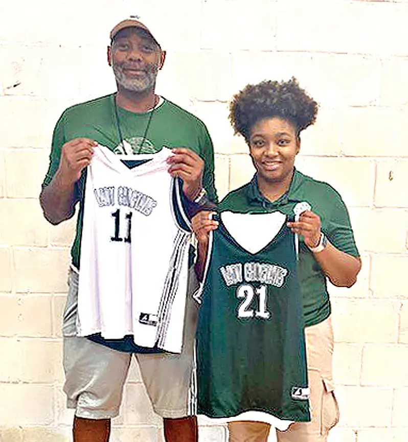 Coach Corey Grayson, left, head boys’ basketball and track coach and member of the West Side Alumni Booster Club, and Coach Raven Hawkins, junior high head girls’ basketball coach, display new uniforms for the West Tallahatchie junior high girls basketball team. (Photo special to The Sun-Sentinel)