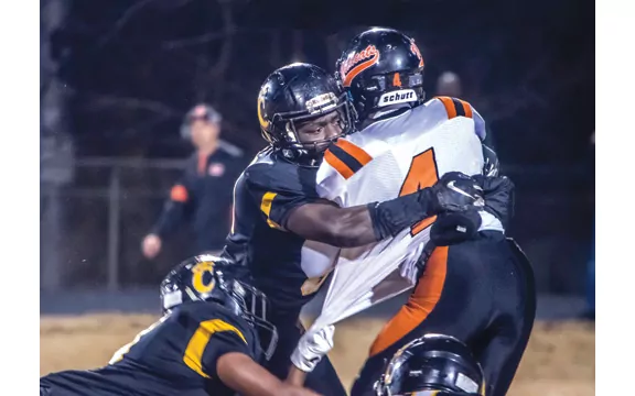 IN THE PHOTO: Charleston defenders take down a Calhoun City ball carrier Friday night. The Tigers’ defense contributed another solid outing to a winning cause. (Photo by Kelly Paris)