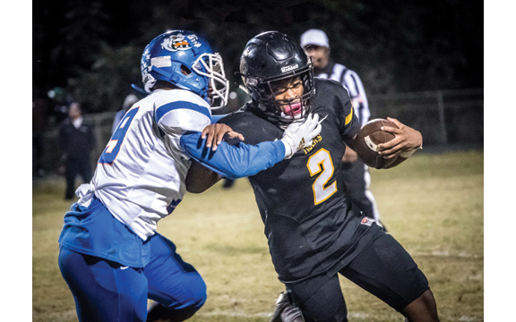IN THE PHOTO: Charleston’s Kristian Gammage tries to escape a North Side defender in Friday night action at Tiger Stadium. Gammage had 13 carries for 54 yards. (Photo by Kelly Paris)