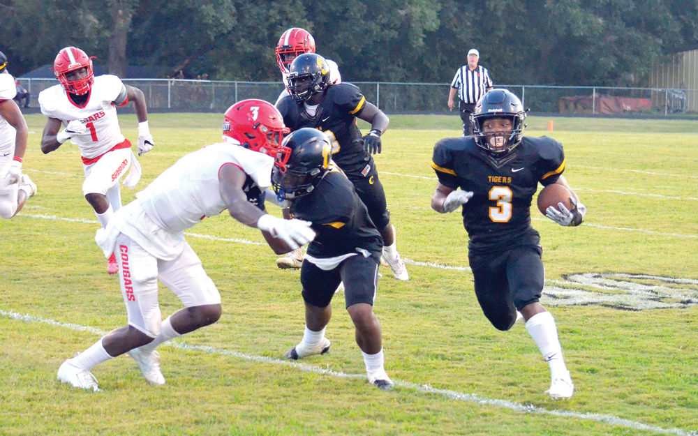 IN THE PHOTO: Charleston’s Keyshun Cashaw carries the football against North Panola Friday night. Cashaw led the team with 14 carries for 43 yards in a 14-0 loss. (Photo by Clay McFerrin)