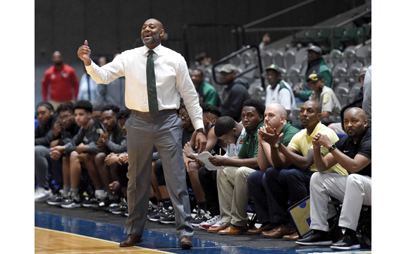 IN THE PHOTO: West Tallahatchie head coach Corey Grayson calls to the offense in the semifinals of the MHSAA Class 1A Basketball Championships on Monday, March 2, 2020, at the Mississippi Coliseum in Jackson. (Photo by Chris Todd)