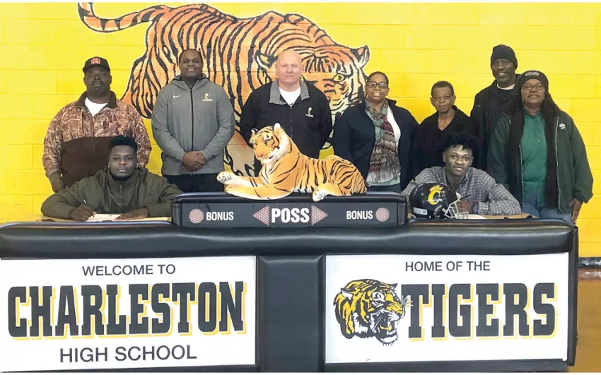 Joining the pair of former Charleston High School football standouts for the ceremony in the CHS gym are (standing from left) Leon Hervey, CHS Defensive Coordinator LaDon Taylor, CHS head coach Scott Martin, Lawanda Dogan, Barbara Henderson, Terrell Brown and Marchelle Street.