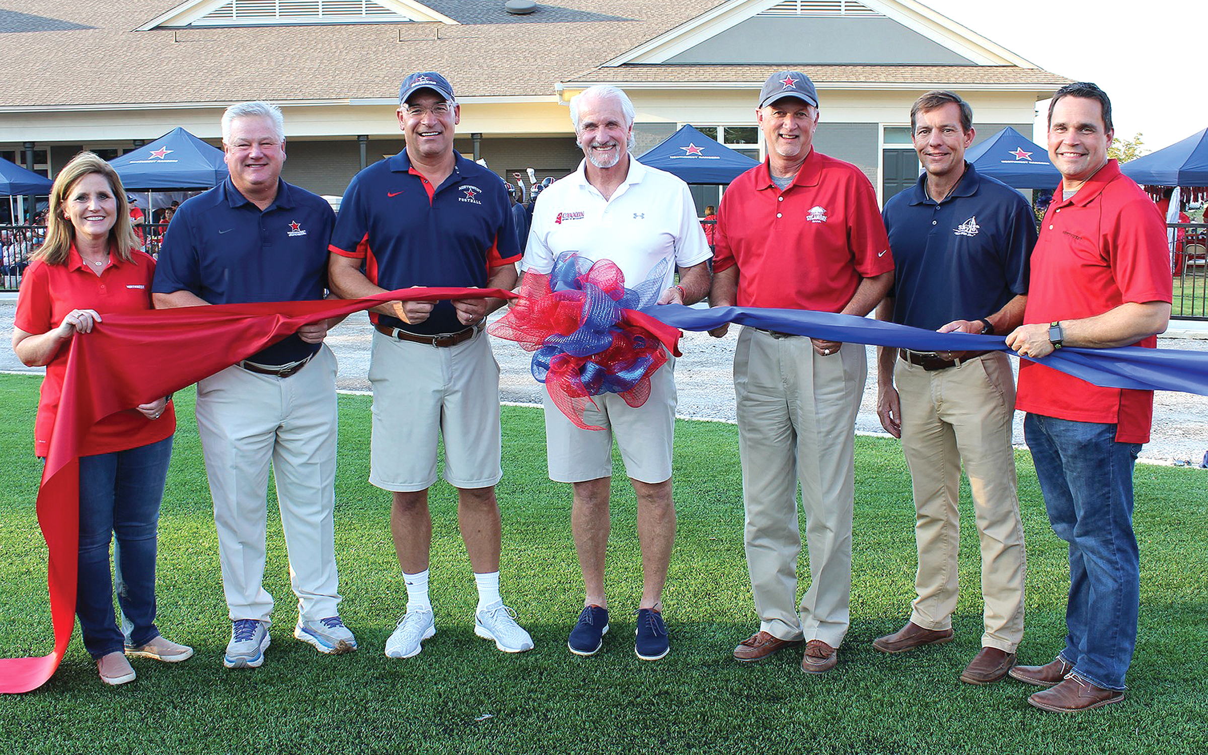 IN THE PHOTO: Northwest Mississippi Community College Executive Director of Institutional Advancement Patti Gordon (far left) and Northwest President Dr. Michael Heindl (far right) welcome benefactors of the college’s new state-of-the-art electronic scoreboard to the Rangers’ football home opener Sept. 5, as the new artificial turf playing surface is officially opened with a pregame ribbon-cutting ceremony. Also participating (from left) are Dr. Edward Field of University Sports Medicine, Steve Thompson of Cornerstone Rehabilitation, Michael Joe Cannon of Cannon Motors of Mississippi, Jay Tindall of Sycamore Bank and Jimmie Stennett of Sayle Oil Company. (Photo by Julie Bauer)