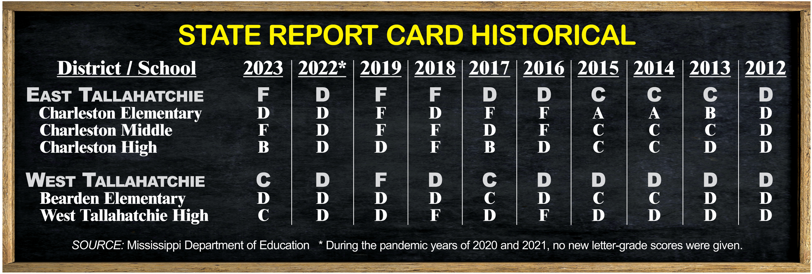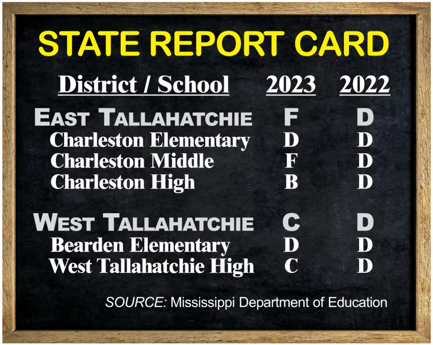 On a districtwide basis, the West Tallahatchie school system improved from a grade of D to a grade of C while East Tallahatchie dropped from a D to an F, based on a comparison of 2021-22 and 2022-23 school year results.