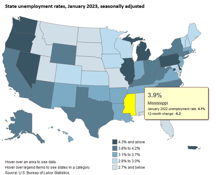 The current unemployment rate for Mississippi (as of January 2023) stands at 3.9 percent.