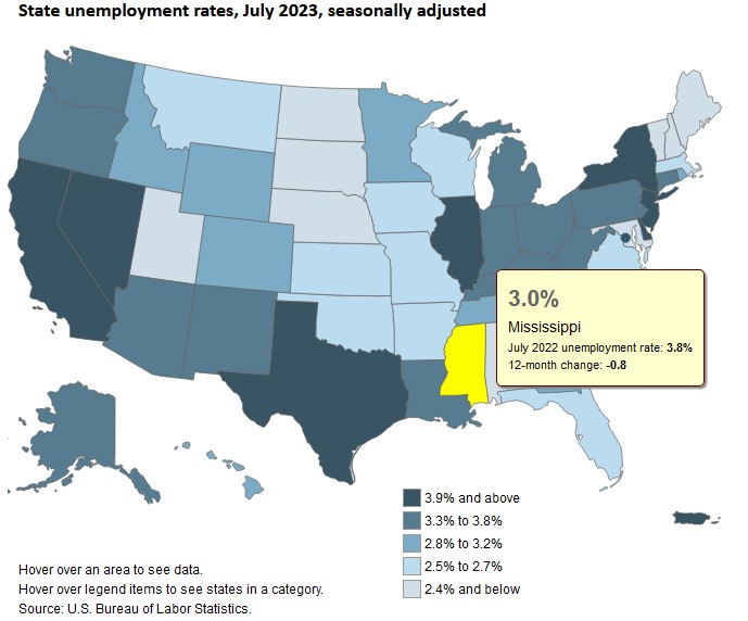 The current unemployment rate for Mississippi (as of July 2023) stands at 3.0 percent.