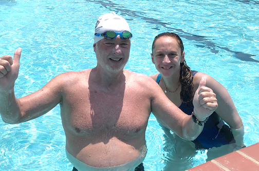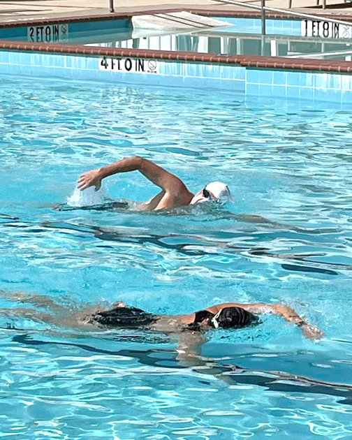 Zane Hodge, above, swims toward his goal of 7 miles with Alaina Matthews, below, swimming her goal of 5 miles. (Photo special to The Sun-Sentinel)