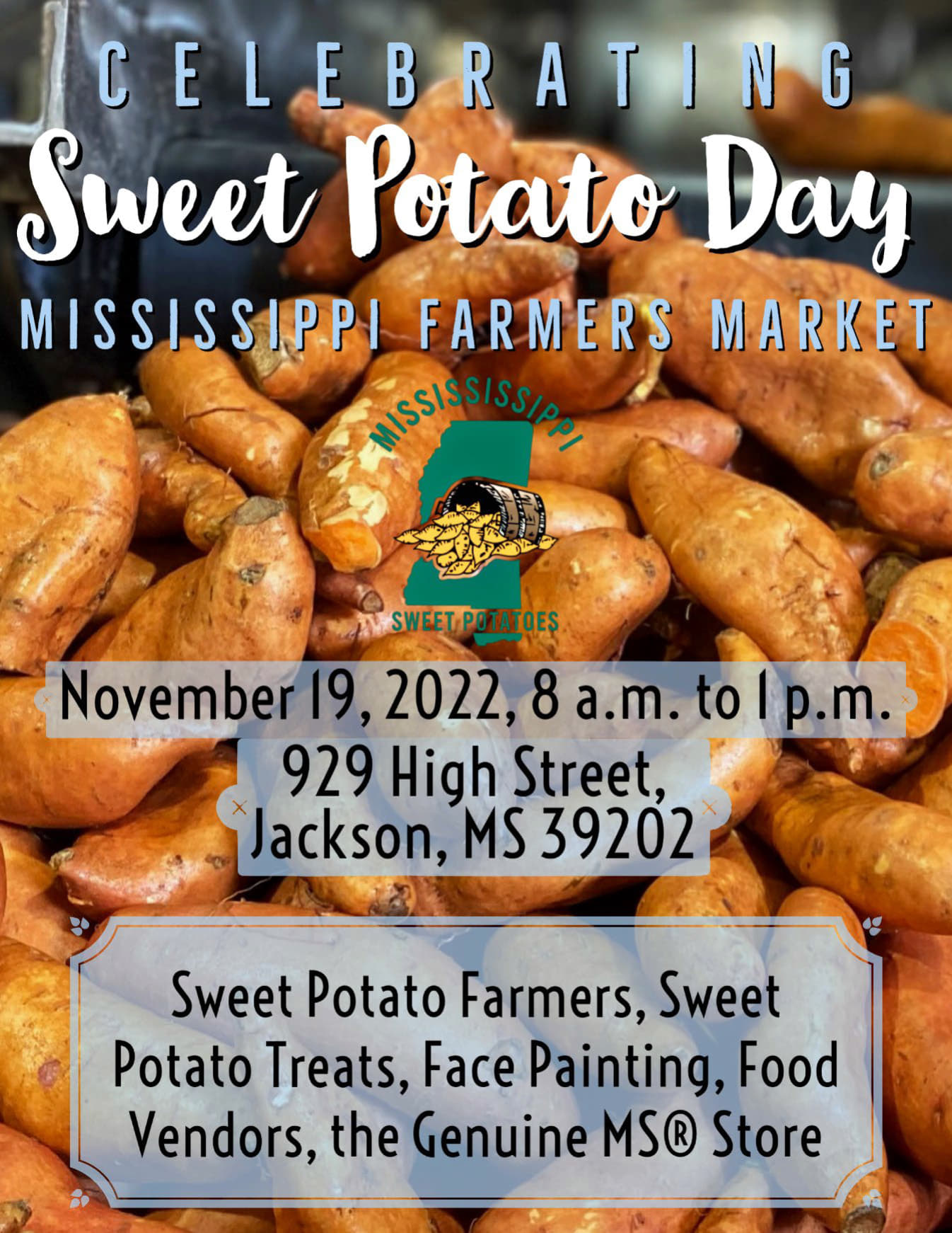 In recognition of one of the state’s top producing crops, the Mississippi Farmers Market will host a Sweet Potato Day on Saturday, November 19, from 8:00 a.m. until 1:00 p.m.