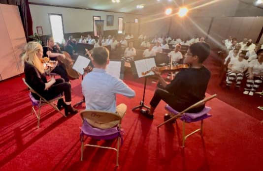 The String Quartet from First Baptist Church of Jackson performed 30 arrangements of music for 68 inmates in the prison chapel. The program included the classical works of Beethoven in addition to Bach and Mozart but there were some traditional gospel hymns and pop culture music performed, including movie scores from John Williams, Andrew Lloyd Webber, Alan Menken, and Hammerstein & Rodgers among other composers.