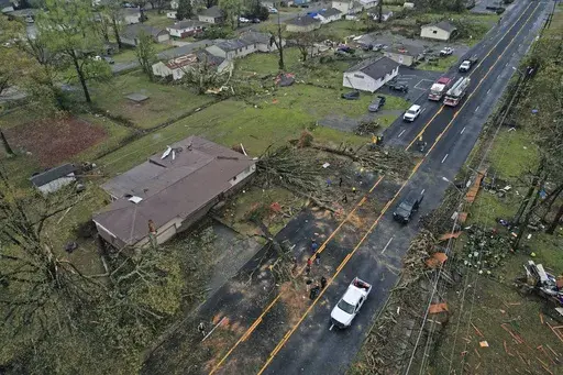 LITTLE ROCK, Ark. (AP) — A monster storm system tore through the South and Midwest on Friday, spawning deadly weather including tornadoes that shredded homes and shopping centers in Arkansas, collapsed a theater roof during a heavy metal concert in Illinois and made a fatal sweep into rural Indiana.