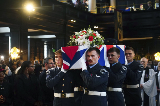 Six RAF pallbearers carried Brown's flag-draped coffin on their shoulders as Edward Elgar's “Nimrod” was played on the pipe organ during the procession. A spray of red and white roses, two of his medals and an RAF dress cap sat atop the Union Jack at the front of the church.