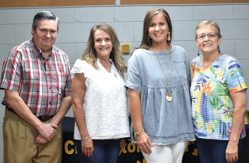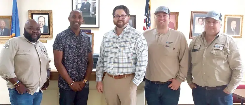From left, Robert Gross Jr., Charleston Mayor Sedrick Smith, Jarrod Bauer, Bailey Killington and Tony Caswell pose for a photo during a Monday, June 17, announcement that CenterPoint Energy had awarded the city of Charleston with a Community Safety Grant of $2,500 to be used to buy safety-related equipment. (Photo by Vanisha Powell)