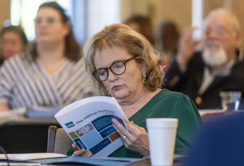 Rep. Becky Currie, R-Brookhaven, looks over a Medicaid report as representatives from The Hilltop Institute give a presentation during a Medicaid hearing at the State Capitol in Jackson, Miss., Tuesday, February 20, 2024. Credit: Eric J. Shelton/Mississippi Today