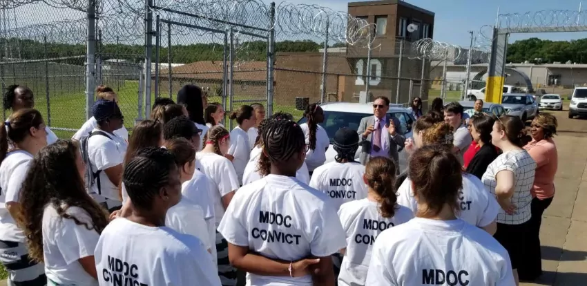 MDOC inmate Bryson West, left, discusses career and education options with Tracy Smith, center, and Cheryl Rush of Delta Technical College during a mental health resources fair held this week at the Youth Offender Unit of the Central Mississippi Correctional Facility.