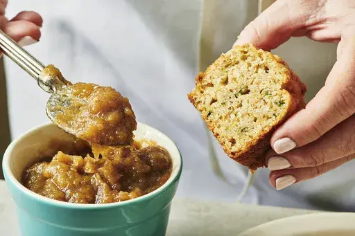 Apple butter is delicious on bread and toast of all kinds. Pumpkin bread or zucchini bread are also great options, underscoring the whole autumnal vibe.