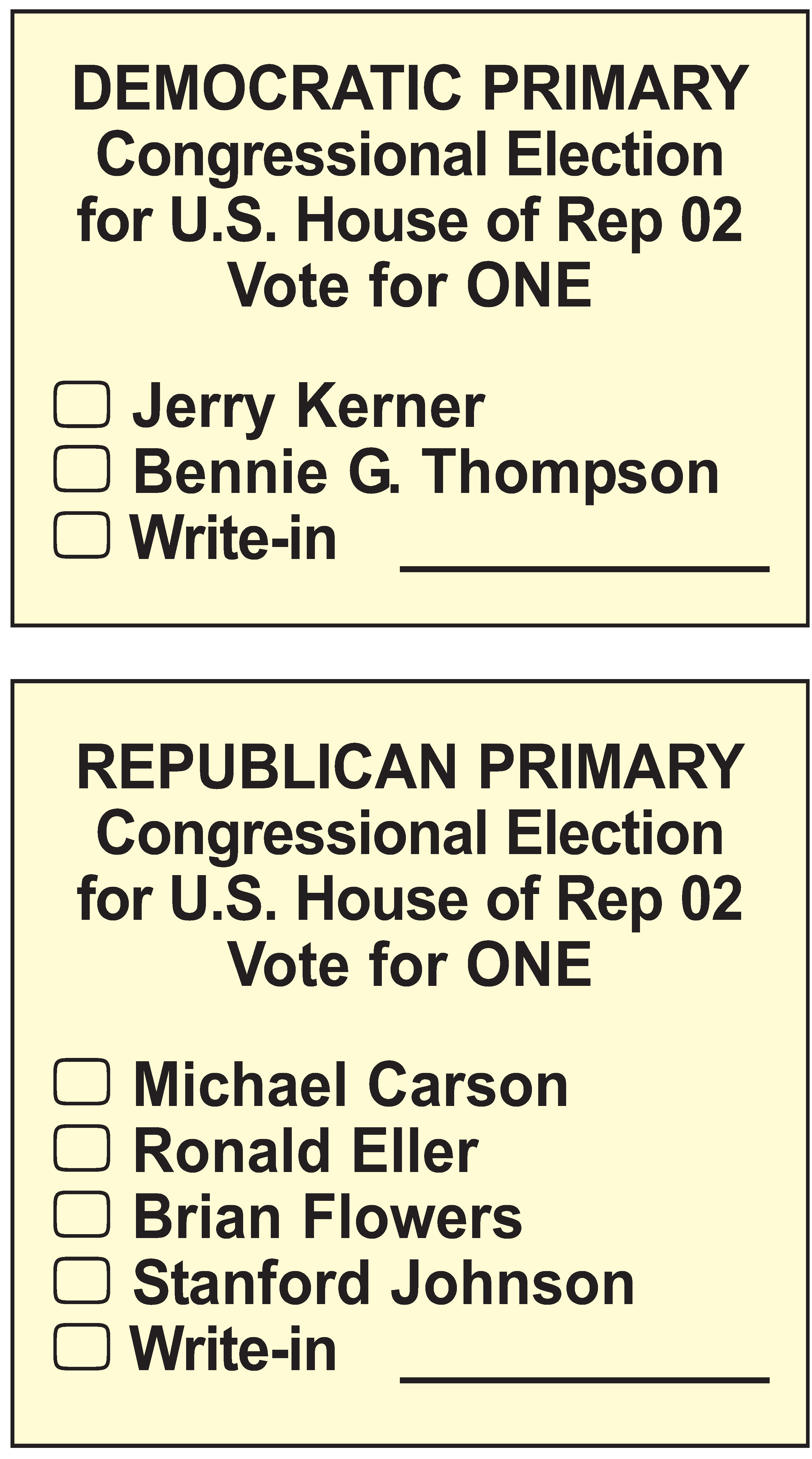 Only one race will appear on local ballots in both party primaries — that for Mississippi’s 2nd Congressional District seat in the U.S. House of Representatives.