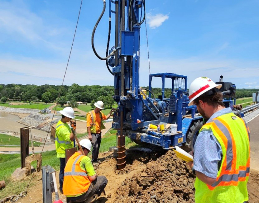 Currently, drill pads are being installed for piezometers, automated instruments used for monitoring groundwater pressure. Relief wells, which act like valves to relieve the water pressure, allow excess water to be diverted safely and serve to prevent sand boils, are scheduled to follow. The additional piezometers increase the USACE-MVK’s monitoring ability by sending data hourly to the technical team, allowing them to analyze conditions in real time.