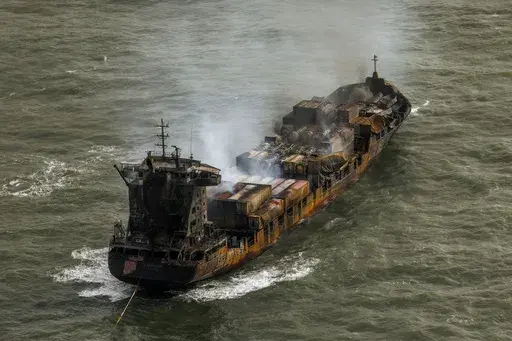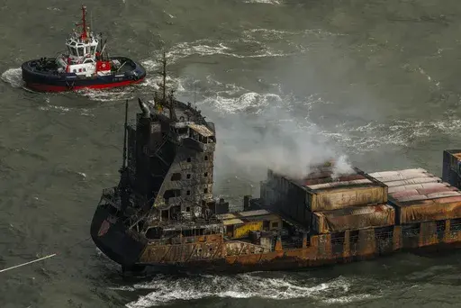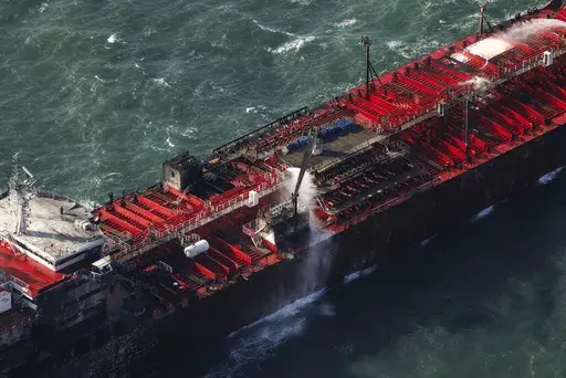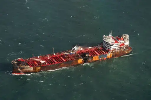 The U.K. coast guard agency said Tuesday that the Solong was still alight. It said the cargo ship, whose front end was crushed and blackened, was drifting south, away from the tanker, and a 1 kilometer (around a ½ mile) exclusion zone had been put in place around both ships.