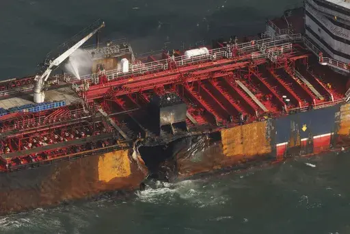 Footage filmed from a helicopter on Tuesday morning showed the fire appeared to largely be out on the tanker, which had a large gash on its port side.