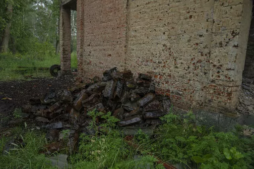 Surrounded by tall pine trees, the school's broken windows offer glimpses of abandoned classrooms that are unlikely to see students again anytime soon. It is just one of many buildings in Yahidne that were shattered by the war.